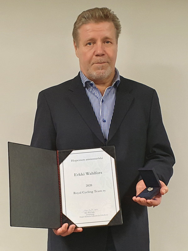 Royal Cycling Teamin puheenjohtajalle Erkki Wahlforsille luovutettiin Päijät-Hämeen Liikunta ja Urheilun myöntämä hopeinen ansiomerkki RCT:n syyskokouksessa 18.11.2020. Merkin luovuttajana toimi RCT:n varapuheenjohtaja Kari Turkia. Erkki Wahlfors kiitti saamastaan huomionosoituksesta seuran hallitusta ja 40-vuotisjuhlatoimikuntaa sekä totesi tämän tunnustuksen kohdistuvan koko Royal Cycling Teamin pyöräilyn hyväksi tekemään työhön. |